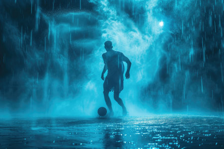 Soccer player dribbling ball on muddy field in rain at night