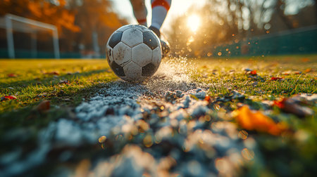 In the midst of an autumn afternoon, a football player skillfully strikes a ball on a lush green field. The sunlight filters through the trees, creating a warm glow, while scattered leaves and a hint of mud add texture to the vibrant scene. Generative AI