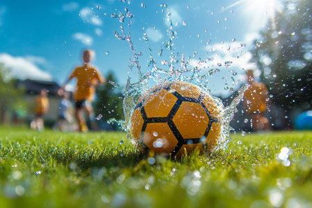 Sunlit soccer scene water splashes around a ball with blurred kids playing in the background