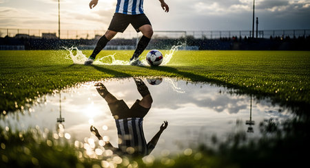 A dynamic, low-angle shot captures a soccer player in action, kicking the ball on a wet grass field and creating a dramatic splash. The player's motion is perfectly mirrored in a large puddle in the foreground, with the setting sun creating a beautiful back-lit silhouette and reflection. This image represents passion, determination, and the beauty of the sport.