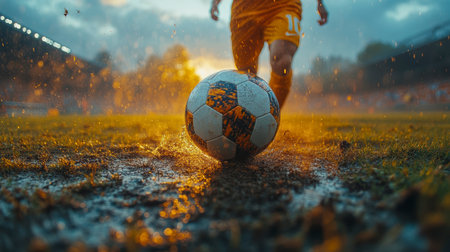 A soccer player kicks a muddy ball on a wet field during an intense match in the late afternoon. Generative AI