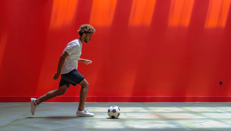Young athlete is practicing his football skills in a modern gym with a large red wall
