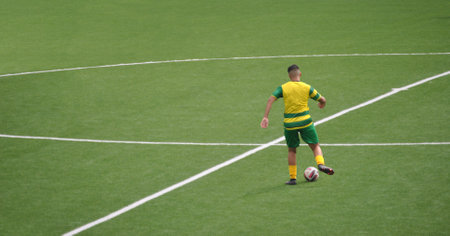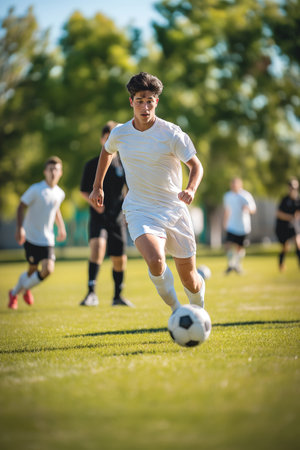 Young Soccer Player Dribbling on Field During Sunny Outdoor Match.