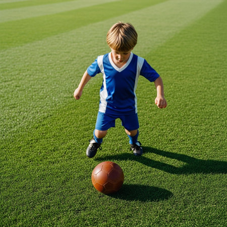 High-angle cinematic shot of a young child playing soccer intensely on a vibrant, freshly cut green