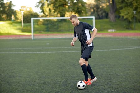sport, football training and people - soccer player playing with ball on field