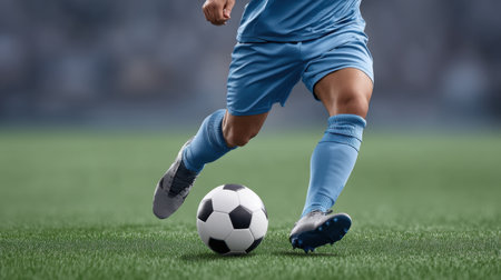 player playing soccer with ball, close up of foot and ball on green grass, by ai generative