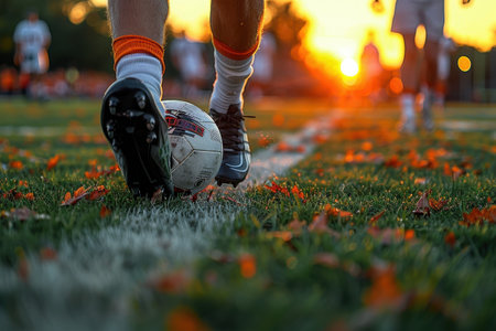 In the midst of an autumn afternoon, a football player skillfully strikes a ball on a lush green field. The sunlight filters through the trees, creating a warm glow, while scattered leaves and a hint of mud add texture to the vibrant scene. Generative AI