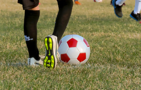 Calgary, Alberta, Canada. May 1, 2023. A close up to a young person about to kick a football soccer ball, wearing Nike soccer cleats.