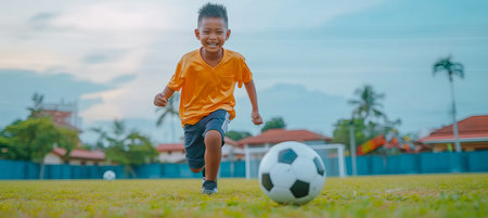 Blurred moving photo of young Boy controlling and kicking ball on green grass close up