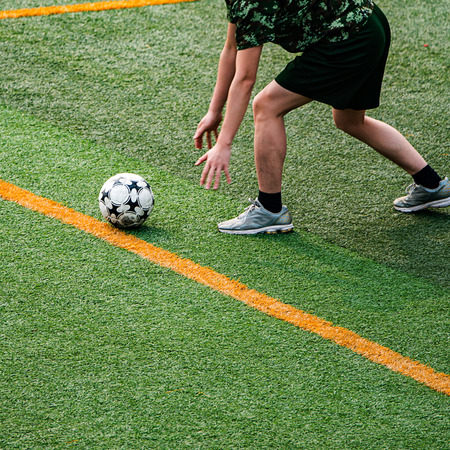Krasnodar, Russia - December 4 2020: boy with a ball on the mini-football field foot on ball