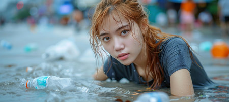 A man on the background of polluted water. Plastic debris in the water.