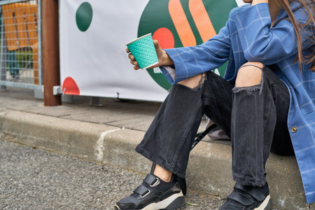 KALININGRAD, RUSSIA - CIRCA JULY, 2022: teenager with paper cup from fast food restaurant Vkusno I Tochka, Russian fast food chain mostly based in former McDonald's restaurants.