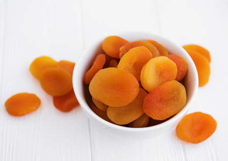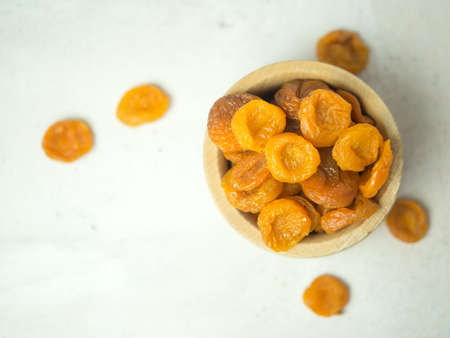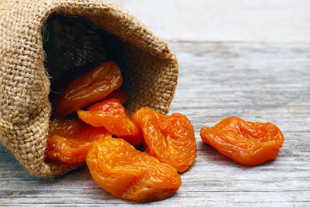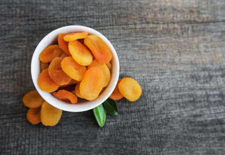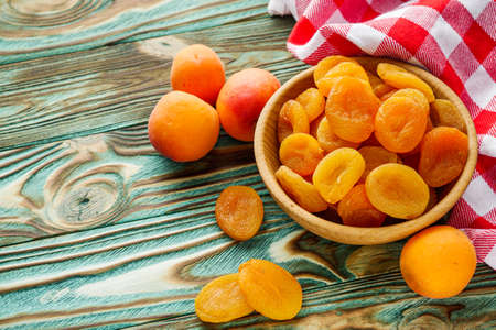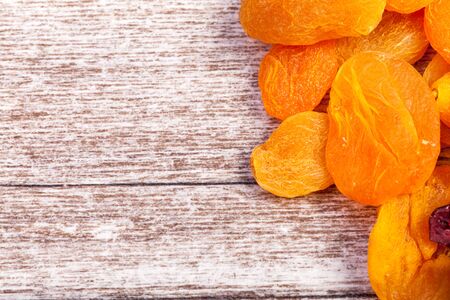 Healthy nutrition diet. Dried apricots set on wooden table background.