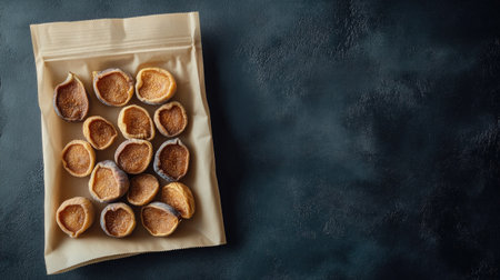A beautiful arrangement of dried fruits in eco-friendly packaging set against a dark background, perfect for showcasing healthy snack options.