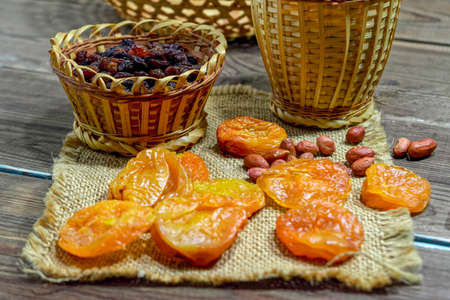 peeled raw peanuts dried apricots raisins on a wooden table background close-up