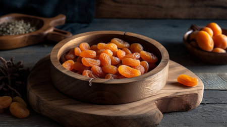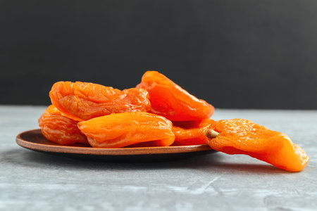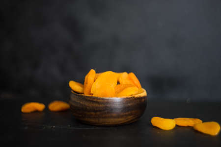 dried apricots in a wooden bowl on a gray concrete table, dried fruits
