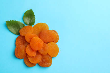 Dry apricots in turquoise bowl on blue background, top view. Heap of dried apricots.