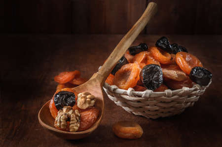 dried apricots in a basket and other dried fruits on a dark wooden background