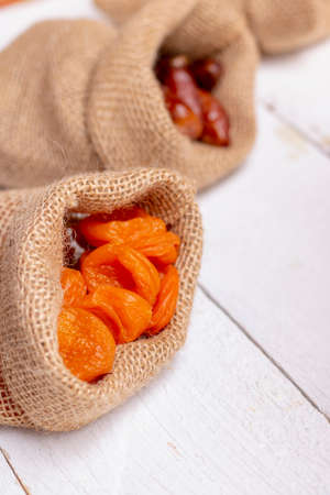 Heap of dried apricots and date fruits in canvas bags. Focus on apricots. Zero waste concept