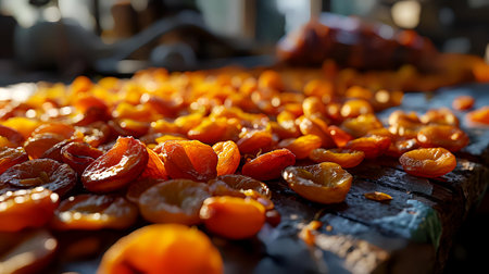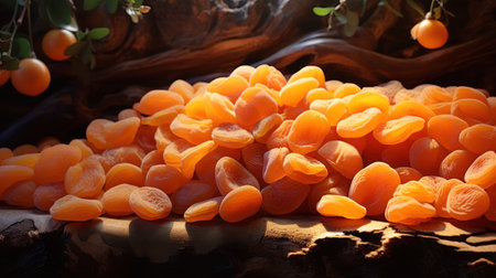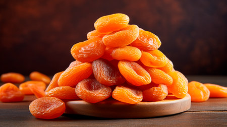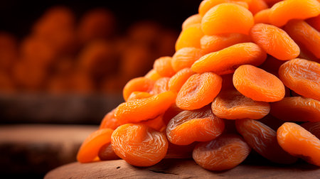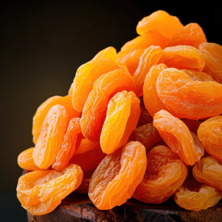 An artistic shot of dried apricots featuring a blend of rich yellow-orange tones and a wrinkled texture, showing their healthy appeal. A perfect close-up of a nutritious dried fruit snack.