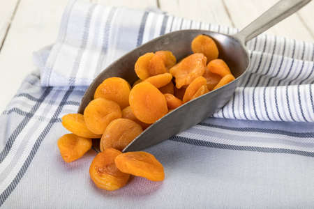 Dried apricots arranged on a fabric and spoon. Composition in the old style with a view from the top and copy space for your text