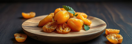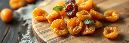 Dried apricots arranged on a wooden board with green leaves enhancing the natural look