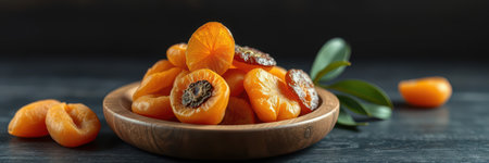 Dried apricots arranged in a wooden bowl with green leaves on a dark surface