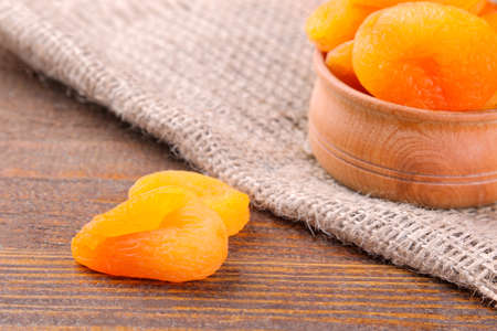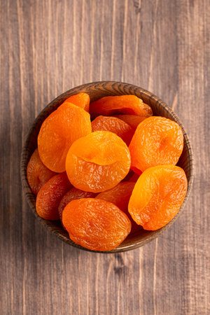 Tasty dried apricots in a wooden bowl closeup on a brown wooden background