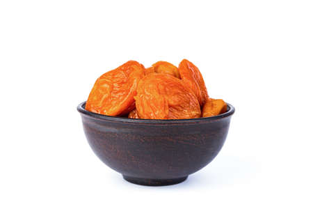 Dried apricots in a brown clay bowl isolated on a white background. Front view