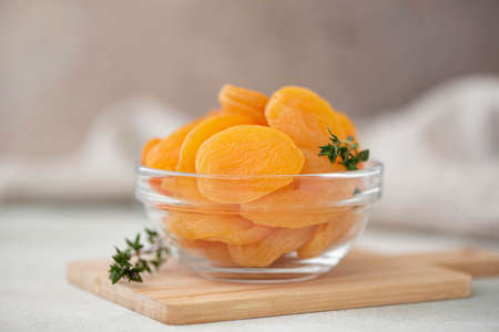 Dried apricots in glass bowl on stone background. Sun-dried yellow apricots. Empty space for text. copy space