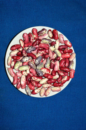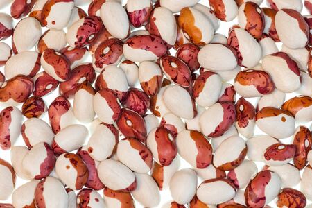 Multi-colored beans on a white background. Red and white beans in a background. Assortment of dried multi-colored beans, healthy ingredient. Bright multi-colored beans. A complete source of protein.