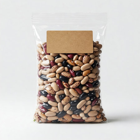 A clear bag filled with a diverse mix of dried beans in various colors and patterns sits on a neutral backdrop. The label is blank, leaving room for customization.