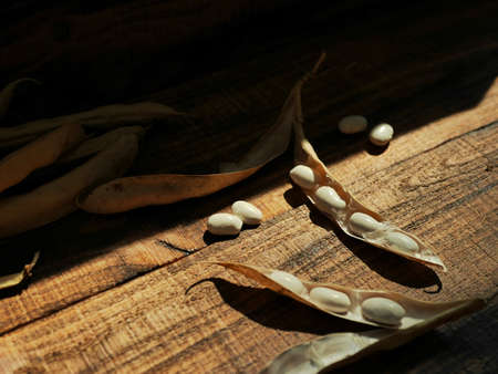 white kidney beans on wooden background. Dried organic harvest of white beans.