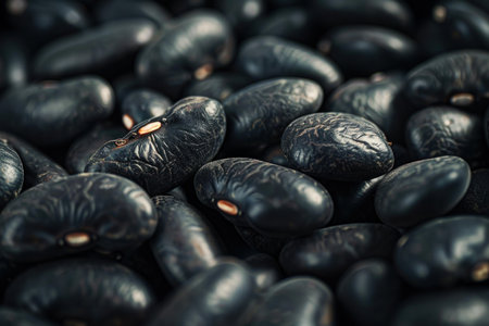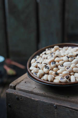 Close-up view full frame background of dried uncooked black-eyed beans seeds stacked together.