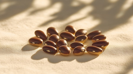 A macro shot of shiny, glossy beans in earthy tones, with a soft blue bokeh background, highlighting textures and natural detail.
