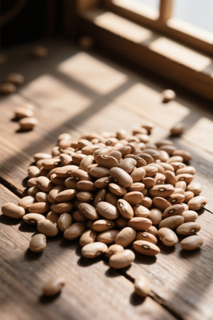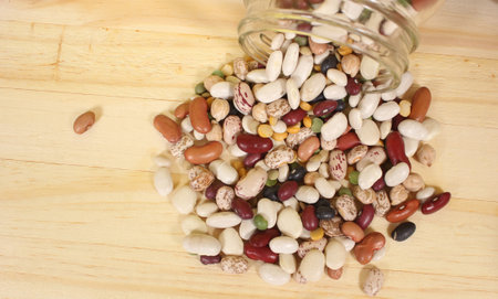 Different beans scattered on a wooden surface close-up. Naturel organic food background