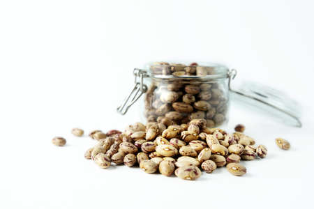Raw beans in a glass jar on a white table background. Copy, empty space for text.