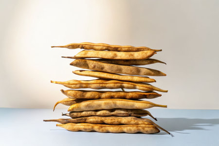 Artistic stack of yardlong beans in minimalist setting muted beige background photography food art