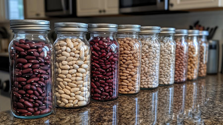 A vibrant assortment of dried beans in different colors and patterns, including red, white, and black beans, arranged in clear glass jars on a kitchen counter.