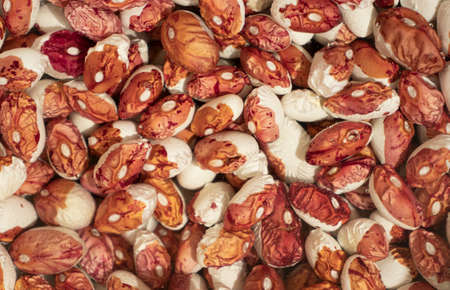 Shelled ripe seeds of kidney bean on heap. Pile of dry raw seeds of haricot (Phaseolus vulgaris) as natural background. Macro close-up. Organic farming, healthy food, BIO viands, back to nature.