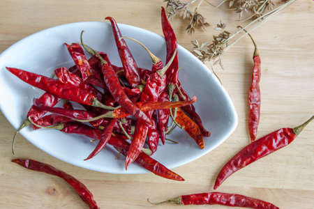 Dry red chili peppers on a wooden rustic table.