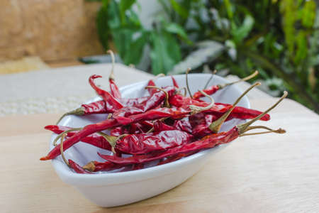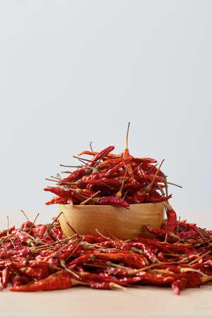 Dried chili peppers in a wooden bowl placed on a wooden table and white wall for copy space for text