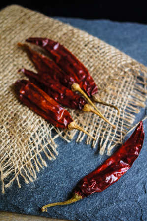 Dried red hot chili peppers on a dark rustic background.