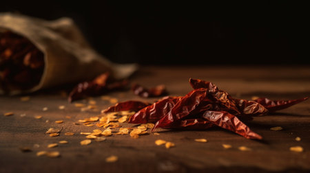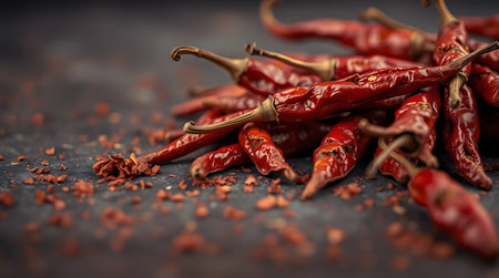 Dried chili peppers are scattered across a dark surface, their red and brown hues catching the light