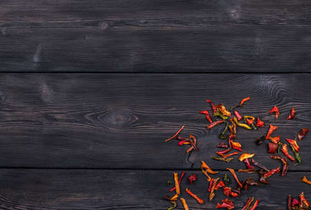 dry red chili peppers on a black wooden table. High quality photo
