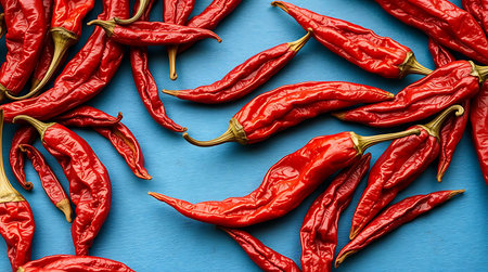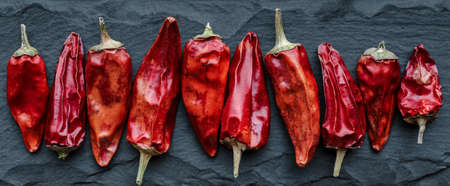 Dried vibrant hot peppers, food background with copy space