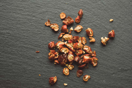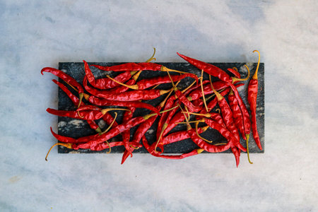 Dry red peppers on a stone table top view flat lay