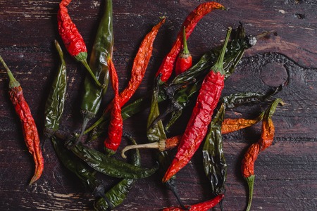 Dried hot red and green chili peppers on brown textured wood