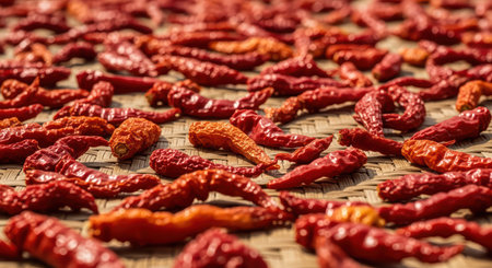 Sun-drying red chili peppers on woven bamboo mat in outdoor setting
