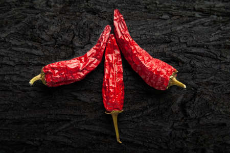 Red dried peppers. Three hot dry chili peppers on a black charcoal surface. Spices for cooking.